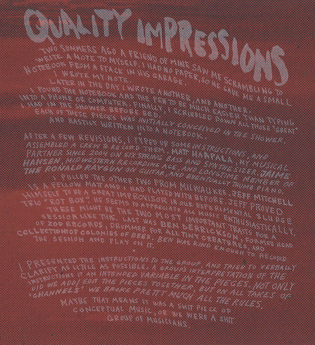 Recorded March 2016 at The Tannery in Milwaukee, WI. Full score/instructions come with the download. 12 page book available with physical copy. PDF copy of the book comes with the digital download.